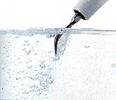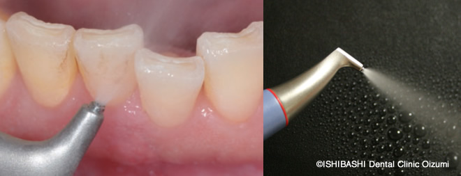 必要に応じて、水と圧縮空気と微小パウダーで汚れを落とすエアフローマスターを使用し、細部の汚れを落とします。