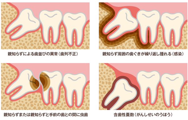親知らずは必ずしも抜歯しなければならないわけではありませんが、存在することで他の歯に悪影響がある場合、あるいは将来的に想定される場合は、抜歯をお勧めします。顎の神経に近い位置に埋まっている場合など、難症例は口腔外科を紹介させていただきますので、ご相談下さい。