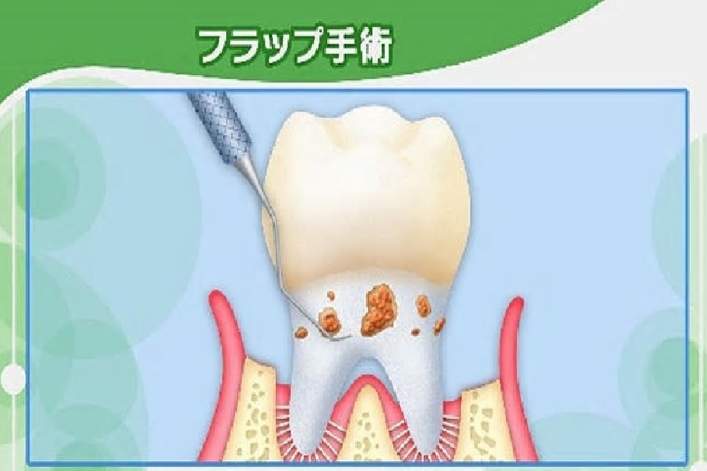 歯周病治療③では、このような部位に対して外科的にアプローチして、歯石を除去するだけでなく、重度に吸収されて複雑な形態になってしまったあごの骨の形を切除又は再生することで可能な限り平坦化し、残存した歯周ポケットを除去するとともに、ブラッシングによって汚れが落としやすい形態に歯茎の形を修正することを目標とします。