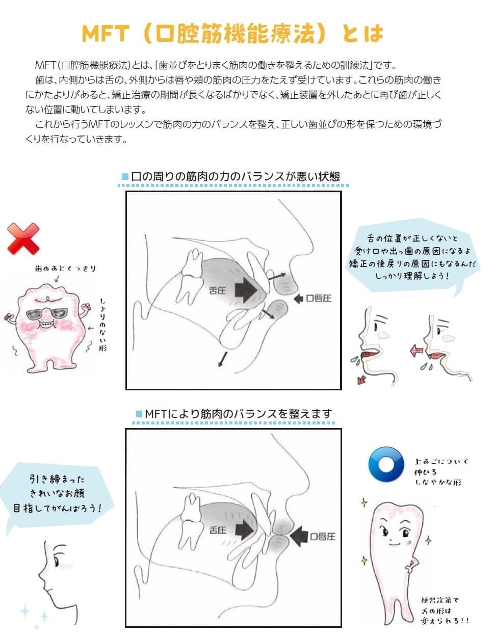 筋機能療法(MFT)は、「歯並びをとりまく筋肉の働きを整えるための訓練法」です。