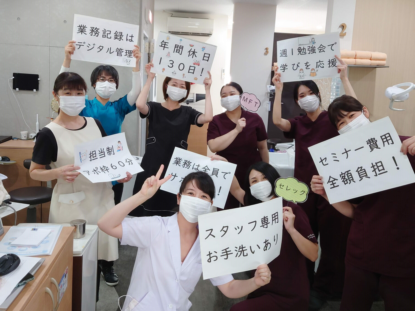 歯周治療は患者担当制、1人60分枠で時間に追われることなく余裕をもって行っていただけます。また、セレック、CT、3Dプリンタ完備で、歯科衛生士業務記録や歯周検査データ、患者診察券や予約簿も全てデジタル管理です。今後の歯科医療に必須となる光学印象採得などデジタル歯科スキル、口腔機能の発育、機能低下抑制に不可欠なMFTスキル等を通常勤務をしながら習得できます。スタッフ同士が助け合い、ストレスなく働ける職場づくりを心掛けています。